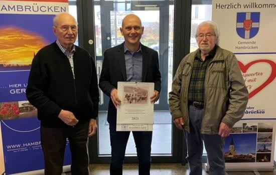 Das erste Exemplar des druckfrischen neuen Hambrücker Heimatkalenders 2023 überreichten Josef Kraus und Franz Köhler von den Heimatfreunden nun an Bürgermeister Dr. Marc Wagner. Auf den einzelnen Monatsblättern sind wieder hochinteressante Bilder aus dem Hambrücker Ortsgeschehen über die letzten Jahrzehnte hinweg abgedruckt, die den Käufern bestimmt viel Freude bereiten. So zeigt die Titelseite eine Ansicht des ehemaligen Gasthauses zum Schwanen (heutiger Standort des Pflegewohnhauses “Alte Feuerwache”). Außerdem sind wieder typische Szenen aus dem Hambrücker Ortsgeschehen abgebildet. So etwa eine Szene von Fastnacht 1963, eine Ansicht vom “Owwerdorf” oder eines Kuhgespannes in der Hauptstraße. Auch typische Szenen aus dem Arbeitsleben vergangener Jahrzehnte, so etwa fleißige Arbeiter/innen in der Tubenfabrik oder bei der Kornernte haben Eingang in das Kalendarium gefunden.