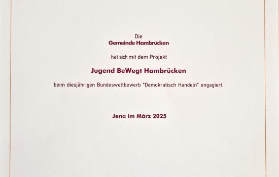 Beim Bundeswettbewerb „Demokratisch Handeln“ 2024 hat sich die Gemeinde Hambrücken mit dem Projekt „Jugend BeWegt Hambrücken“ engagiert.