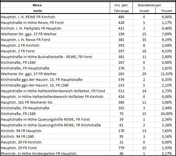 In den Monaten Oktober, November und Dezember 2024 wurden die gefahrenen Geschwindigkeiten von ca. 7.400 Fahrzeugen in einer Überprüfungszeit von ca. 44 Stunden gemessen. Bei den ca. 7.400 Messungen gab es 213 Beanstandungen, die zwei Hauptgruppen waren 150 Fahrzeuge im Bereich bis 10 km/h und 42 Fahrzeuge im Bereich 11–15 km/h. Die prozentual meisten Beanstandungen wurden in der Kirchstraße festgestellt. Bitte berücksichtigen Sie, dass auch Einsatzfahrten in den Statistiken enthalten sein können.