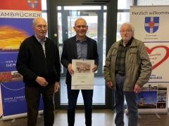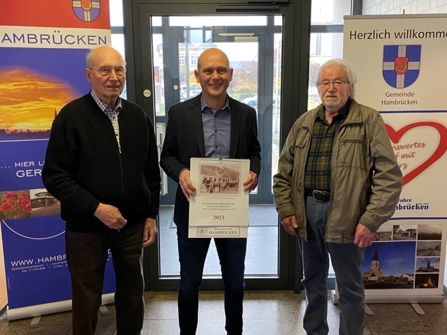Das erste Exemplar des druckfrischen neuen Hambrücker Heimatkalenders 2023 überreichten Josef Kraus und Franz Köhler von den Heimatfreunden nun an Bürgermeister Dr. Marc Wagner. Auf den einzelnen Monatsblättern sind wieder hochinteressante Bilder aus dem Hambrücker Ortsgeschehen über die letzten Jahrzehnte hinweg abgedruckt, die den Käufern bestimmt viel Freude bereiten. So zeigt die Titelseite eine Ansicht des ehemaligen Gasthauses zum Schwanen (heutiger Standort des Pflegewohnhauses “Alte Feuerwache”). Außerdem sind wieder typische Szenen aus dem Hambrücker Ortsgeschehen abgebildet. So etwa eine Szene von Fastnacht 1963, eine Ansicht vom “Owwerdorf” oder eines Kuhgespannes in der Hauptstraße. Auch typische Szenen aus dem Arbeitsleben vergangener Jahrzehnte, so etwa fleißige Arbeiter/innen in der Tubenfabrik oder bei der Kornernte haben Eingang in das Kalendarium gefunden.
