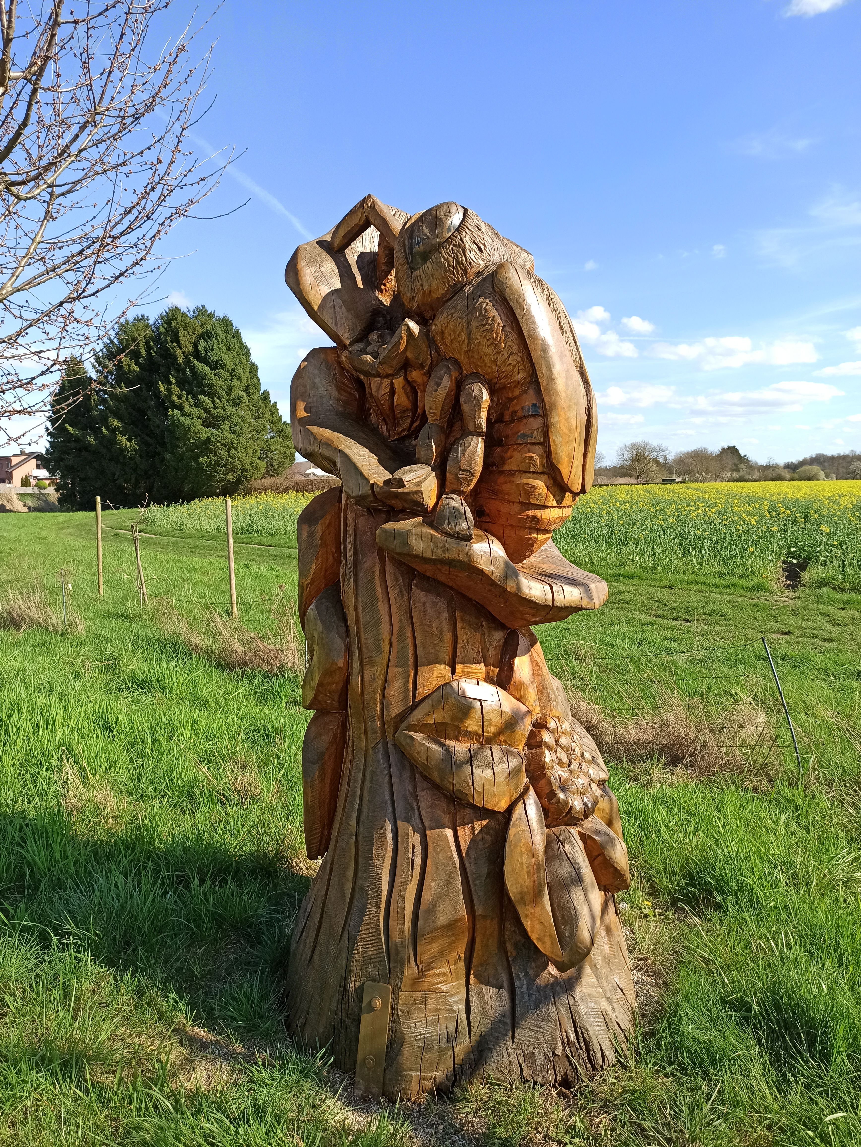 Den Weg weiter entlang findet sich eine weitere Holzskulptur aus dem Wurzelstock einer 60-jährigen Douglasie und geradeaus am Waldrand sind drei 150-jährige Eichen zu bestaunen.
