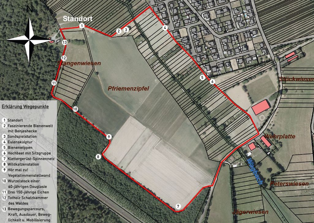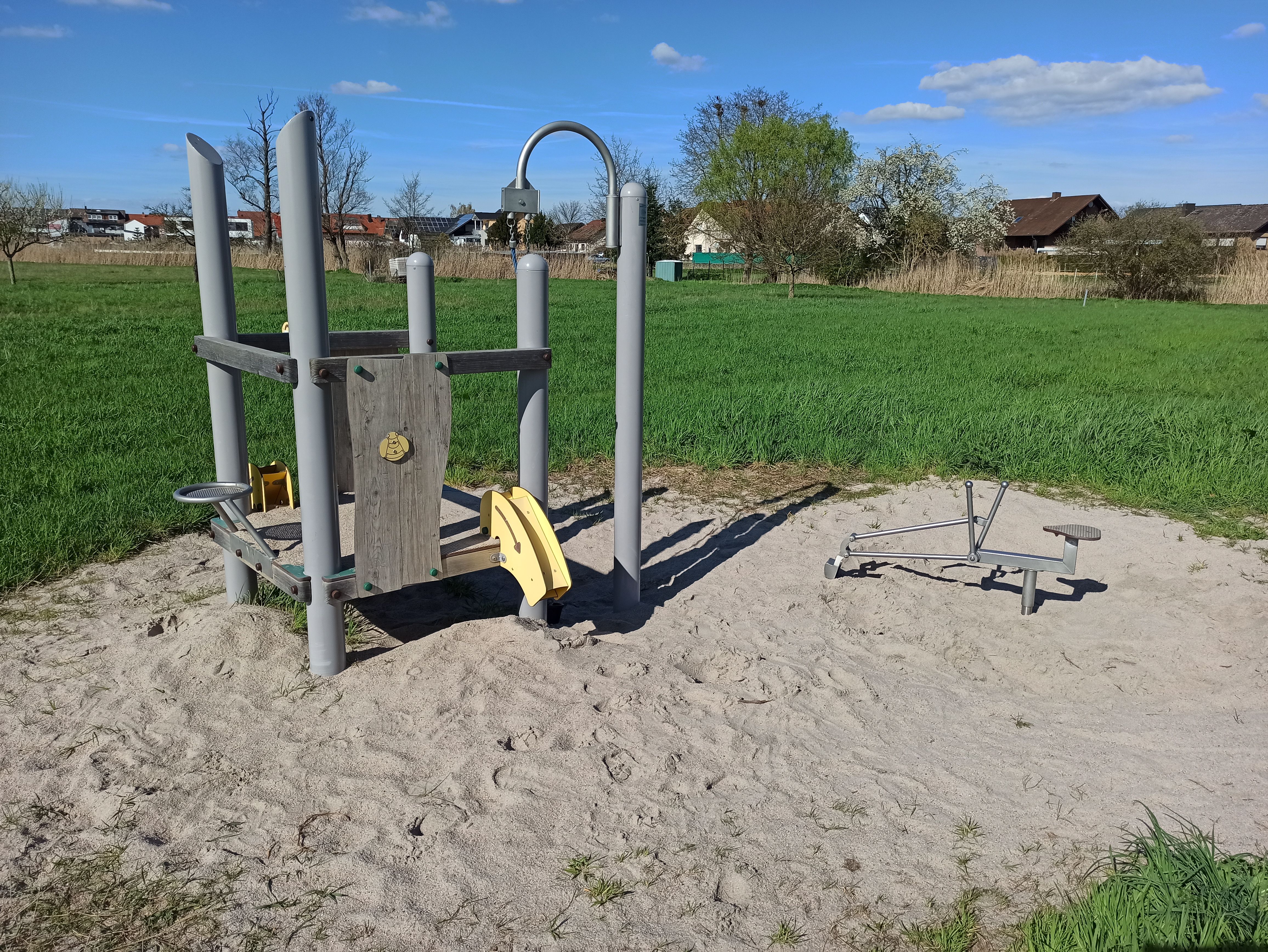 Ca. 200 Meter weiter finden sich unsere beiden Bienenwippen. Diese stehen auf einer Wiese, auf der Kinder die Natur hautnah genießen und entdecken können, während die Eltern es sich auf der gegenüberliegenden Seite des Weges auf unserer Sitzgruppe, die sich auf einer kleinen Anhöhe befindet, entspannen können. Dort wurde auch ein mit Kräutern bepflanztes Hochbeet errichtet.