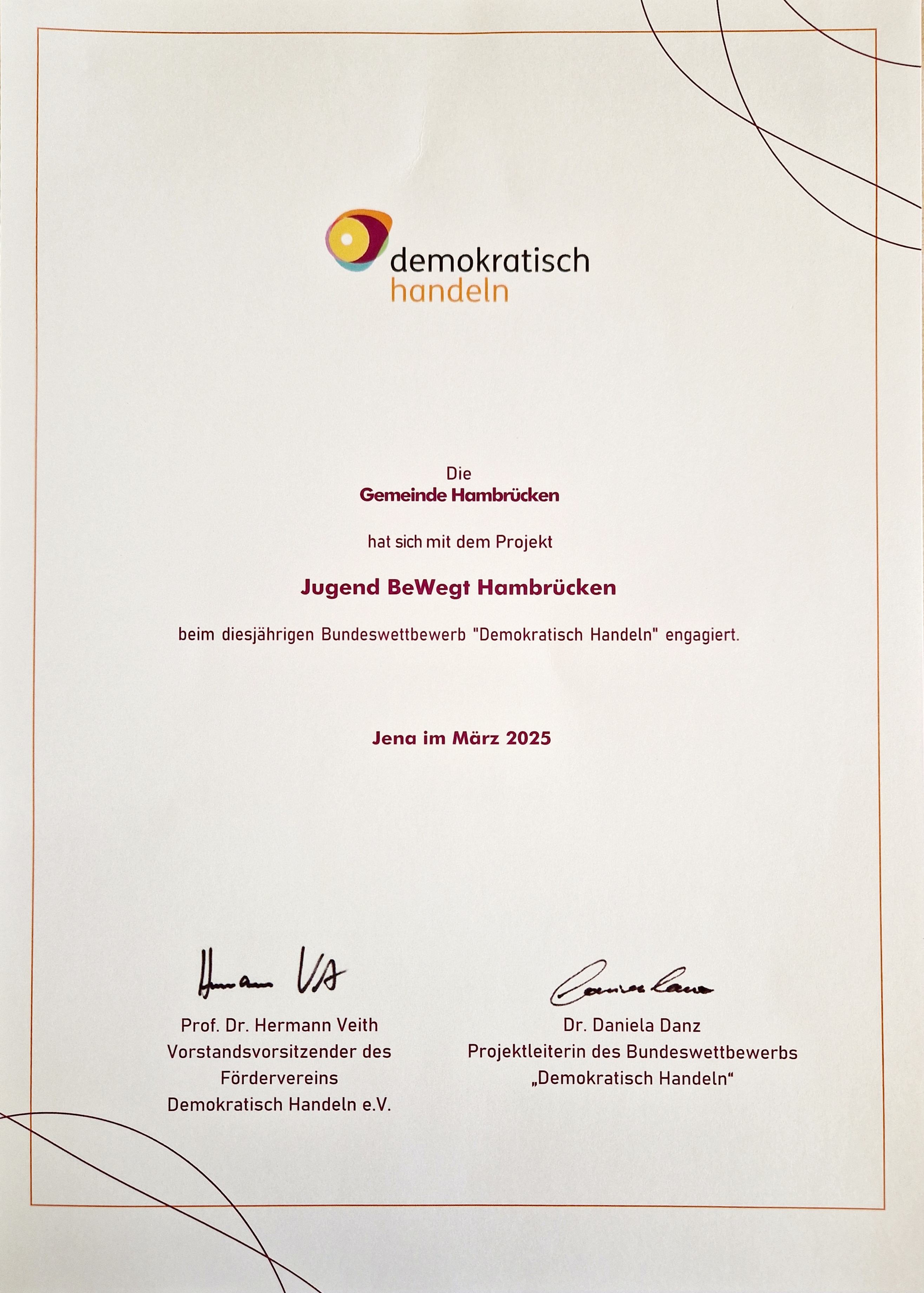 Beim Bundeswettbewerb „Demokratisch Handeln“ 2024 hat sich die Gemeinde Hambrücken mit dem Projekt „Jugend BeWegt Hambrücken“ engagiert.