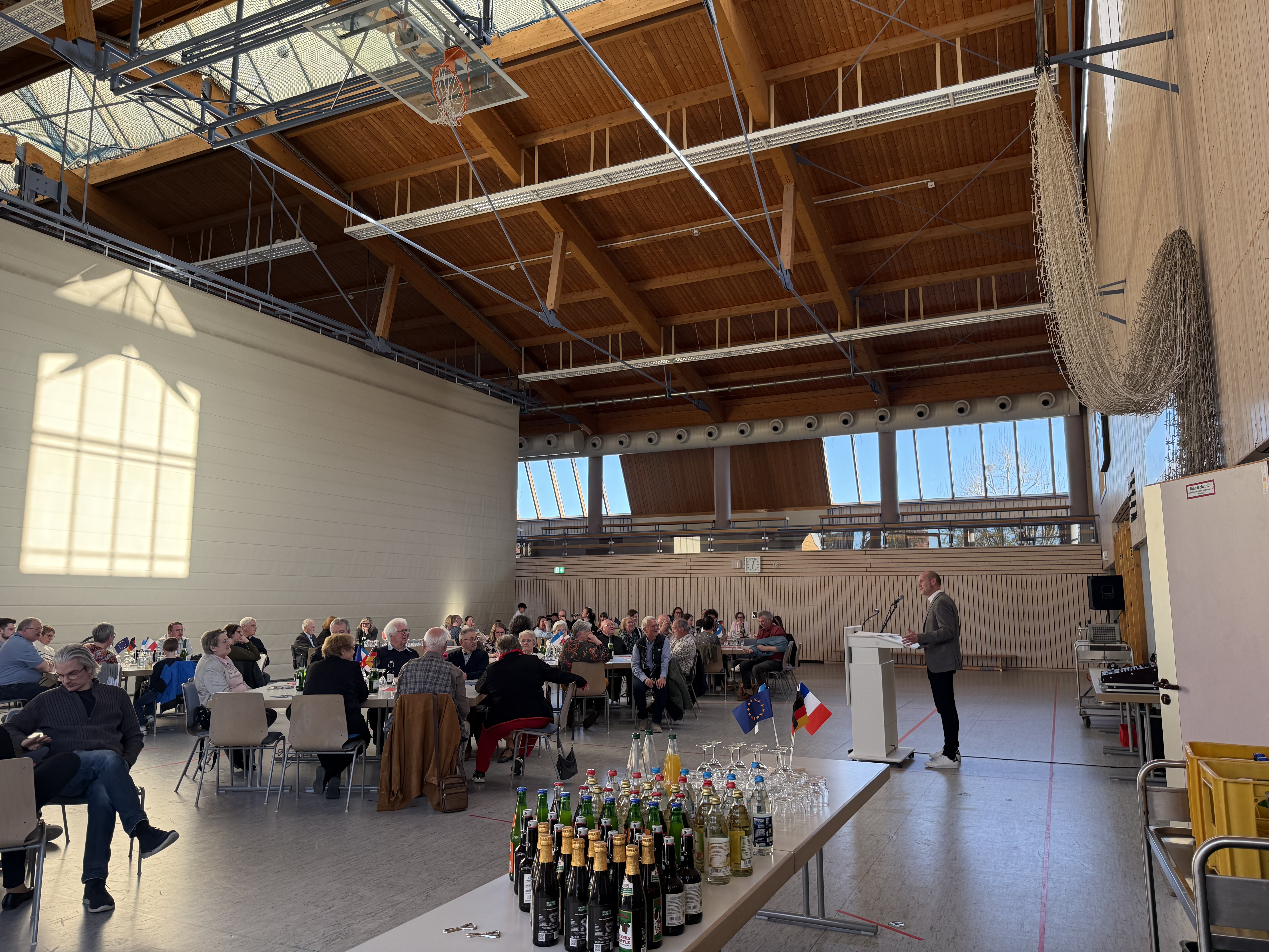 Um die Beziehung zur französischen Partnergemeinde La Bouëxière zu pflegen, kamen am Samstagabend, den 05.04.2025, 40 Teilnehmer*innen aus La Bouëxière mit dem Bus bei uns in Hambrücken an. Zur Freude von Bürgermeister Dr. Marc Wagner befanden sich auch 15 Jugendliche unter den Reisenden. Die französischen Gäste wurden mit Begrüßungsgetränken sowie Fingerfood in Empfang genommen. Die Wiedersehensfreude war groß, denn es gab nach einem Jahr auf beiden Seiten wieder viel zu berichten.