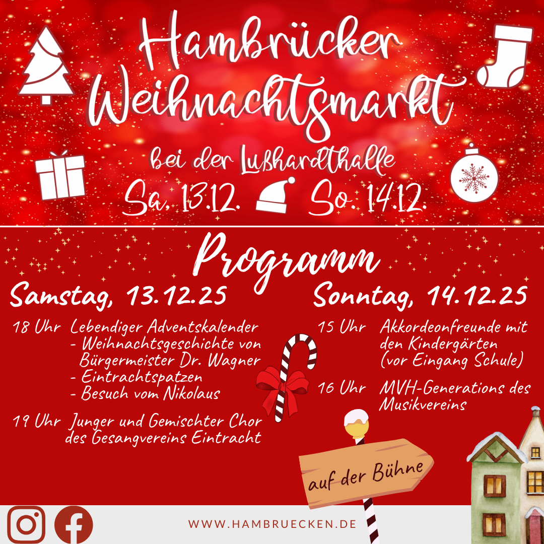 im Namen aller Teilnehmer darf ich Sie zum Hambrücker Weihnachtsmarkt 2025 rund um die und in der Lußhardthalle ganz herzlich begrüßen und willkommen heißen.
