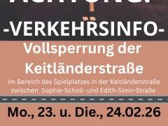 In der Zeit vom 23.-24.02.26 werden im Bereich des Spielplatzes in der Keitländerstraße zwei sogenannte Berliner Kissen auf der Straße montiert. Diese Maßnahme dient unter anderem dazu, die allgemeine Verkehrssicherheit zu erhöhen und die Kinder, welche den dortigen Spielplatz besuchen oder verlassen möchten besser zu schützen. Das Teilstück der Keitländerstraße zwischen der Sophie-Scholl-Straße und Edith-Stein-Straße muss für die Montage zeitweise gesperrt werden.